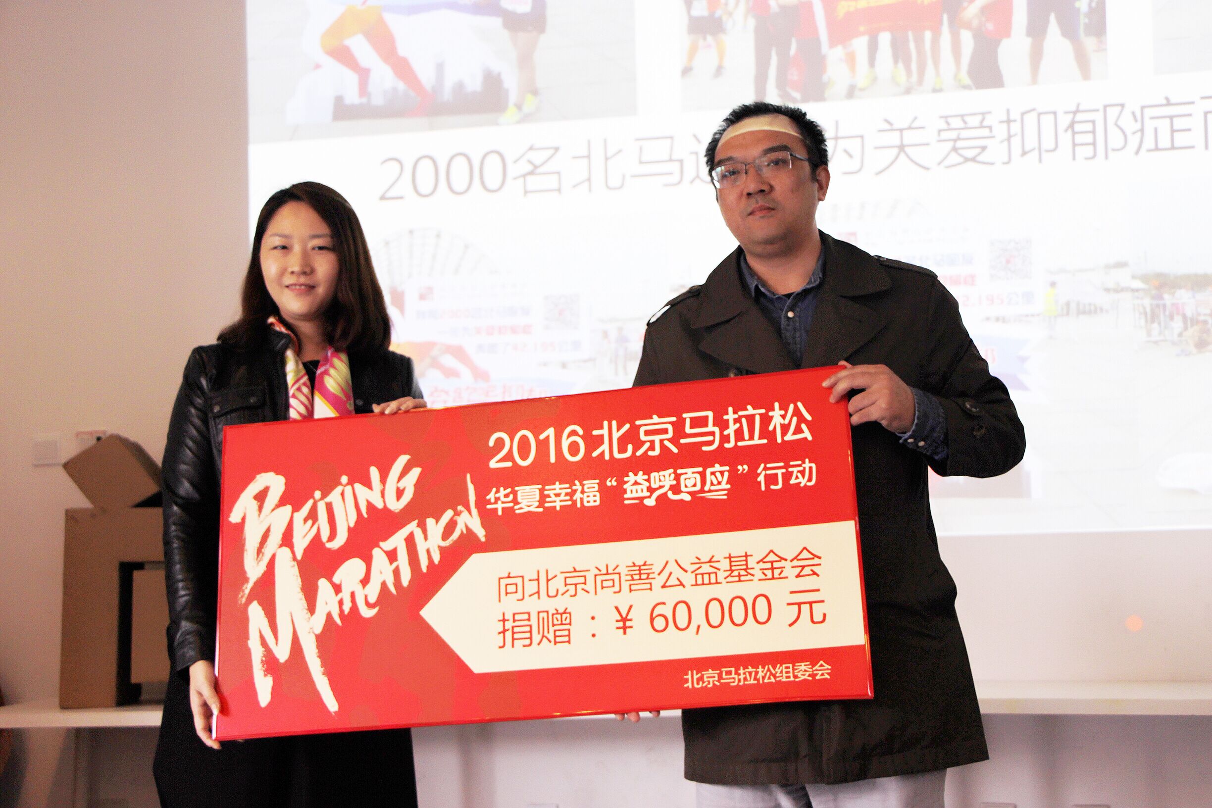 2016年10月25日,第二届“关爱精神健康 尚善公益传播奖”启动沙龙在北京举办。在沙龙现场,2016北京现代 · 北京马拉松华夏幸福“益呼百应”行动被作为优秀创新传播行动现场分享,并被提名入围尚善公益传播奖。中奥路跑公司副总经理刘岳女士代表2016年北京马拉松组委会,向北京尚善公益基金会捐赠了华夏幸福“益呼百应”行动筹集的6万元的爱心善款。这笔善款将用于支持“奔跑吧抑郁”北京和上海跑团的日常跑步活动和传播行动,直接帮助到更多抑郁症患者受益于跑步,跑出心理阴霾。